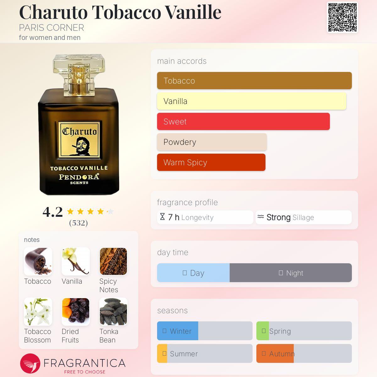 Charuto Tobacco Vanille by Paris Corner es un perfume unisex cálido, dulce y ahumado, con un aroma elegante que mezcla vainilla cremosa y tabaco refinado.