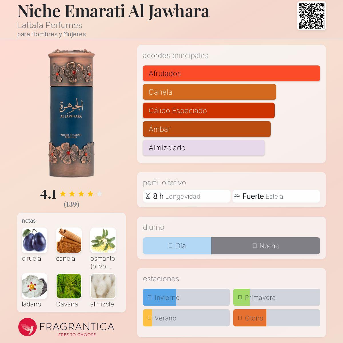 Niche Emarati Al Jawhara by Lattafa es un perfume masculino intenso, amaderado y lujoso, con un aroma profundo que proyecta fuerza y elegancia.